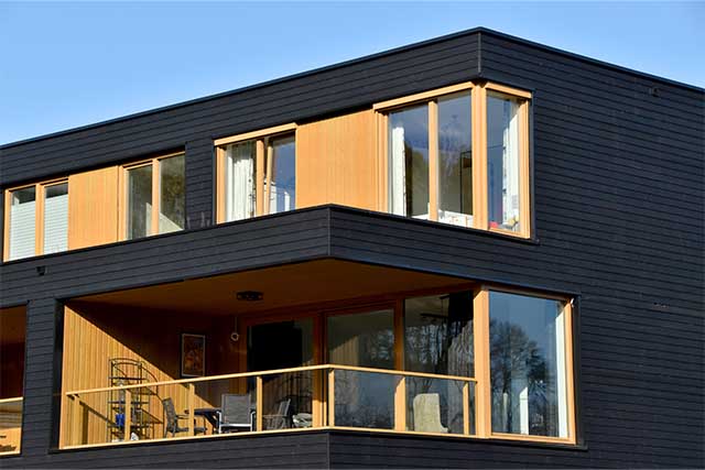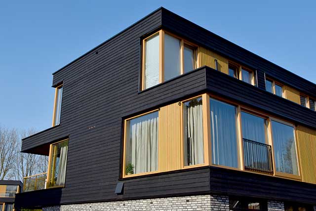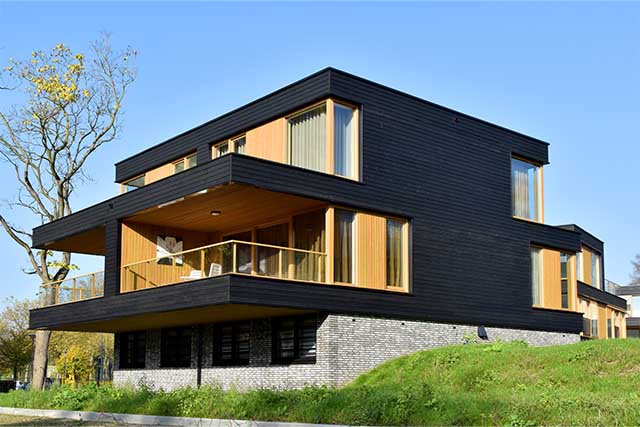 Het project De Buitenkans, gelegen aan de noordelijke entree van Park de Twee Heuvels in Rotterdam, bestaat uit 32 duurzame woningen, verdeeld over twee- en drie-onder-een-kapwoningen. De woningen zijn zorgvuldig geïntegreerd in het omliggende landschap door het gebruik van natuurlijke materialen. De verhoogde terrassen bieden zowel privacy als een prachtig uitzicht. Duurzame kenmerken, zoals groene daken, zonnepanelen en waterinfiltratiesystemen, dragen bij aan een energiezuinige woonomgeving. De gevelafwerking van geborsteld Vuré Noir® in Sansin Enviro Stain Ebony Black zorgt voor een moderne en robuuste uitstraling.