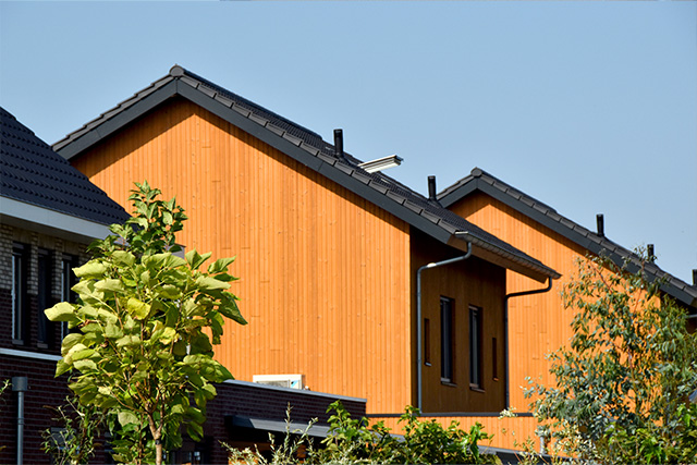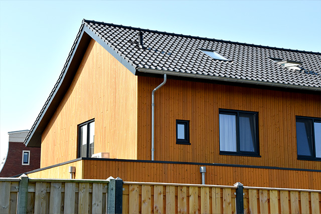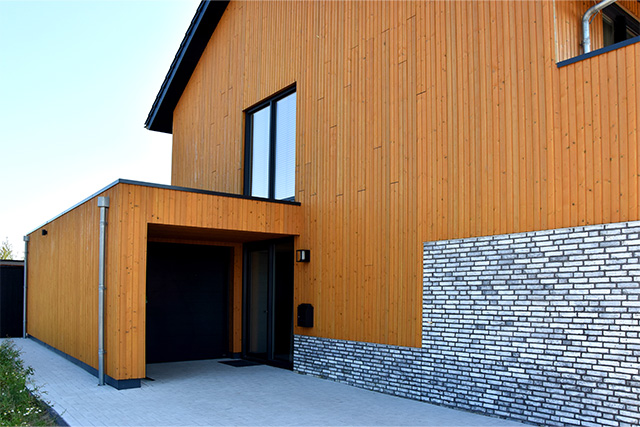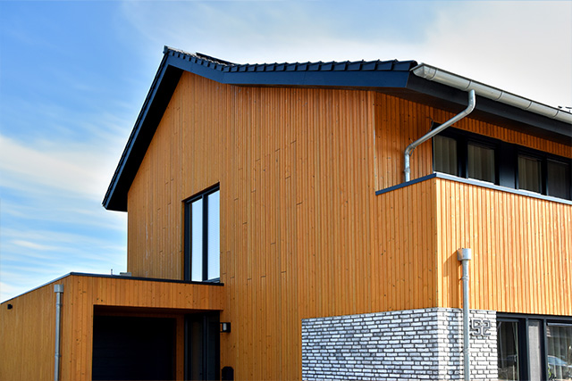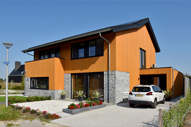 De gevels zijn afgewerkt met Vuré Noir®, dat samen met de lichte steensoorten voor een prachtige, natuurlijke uitstraling zorgt. Deze combinatie van materialen maakt de woningen tot echte blikvangers in de straat. Het bijzondere ontwerp wordt verder geaccentueerd door een opvallende knik in het dak.